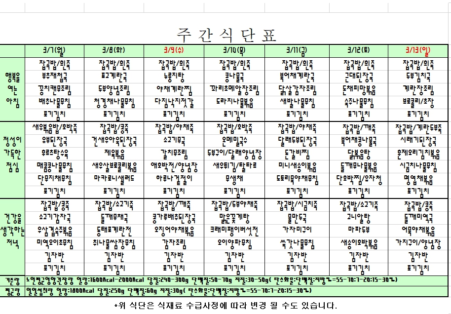2022. 03. 07 ~ 03. 13 주간식단표