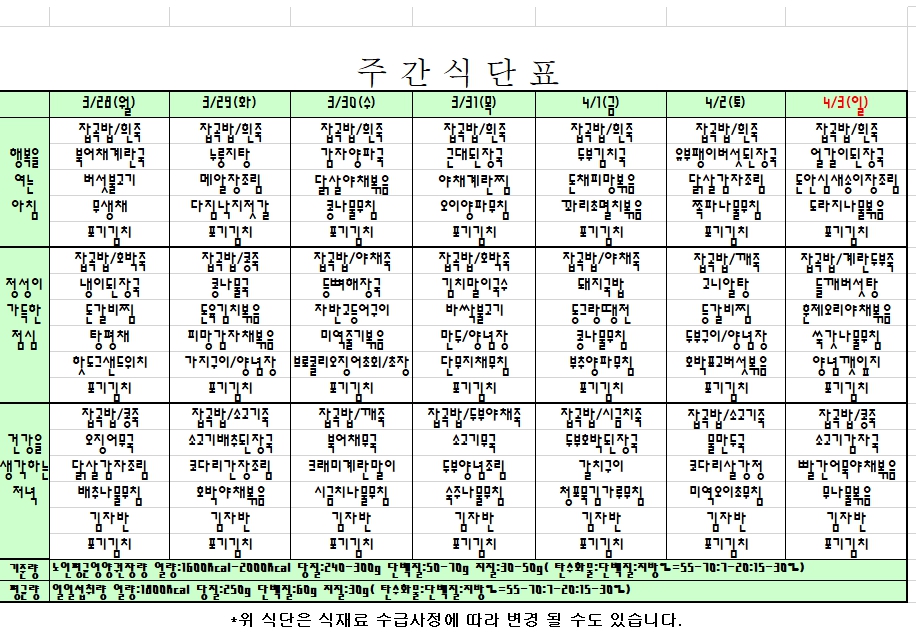 2022. 03. 28 ~ 04. 03 주간식단표