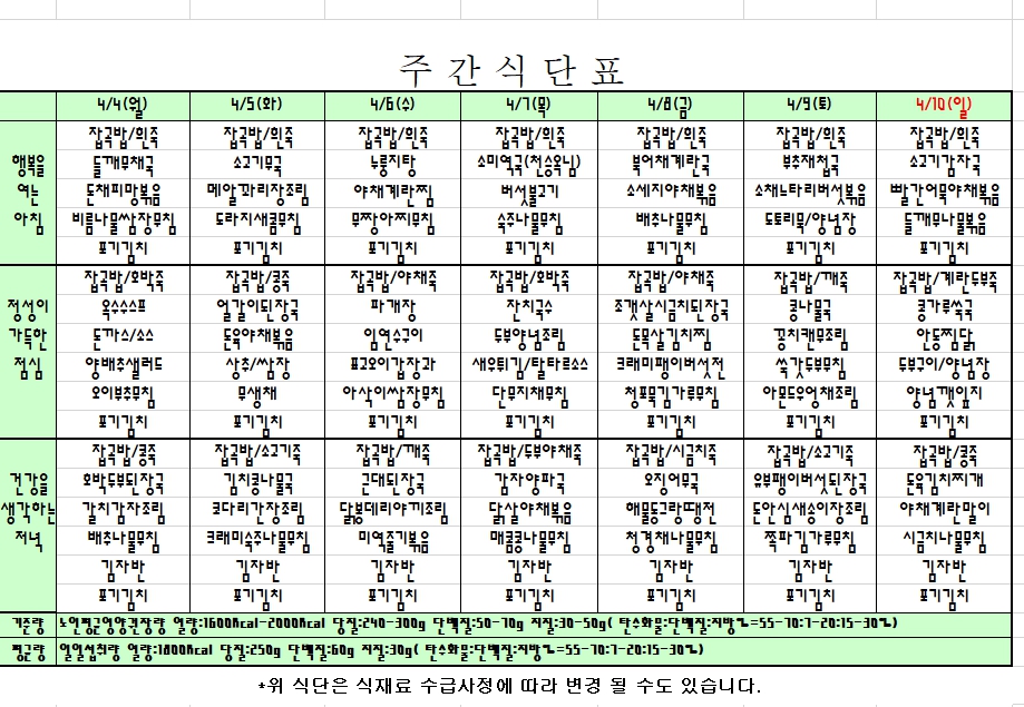 2022. 0. 04 ~ 04. 10 주간식단표 입니다. |