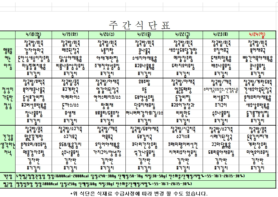 2022. 04. 18 ~ 04. 24  주간식단표 입니다.