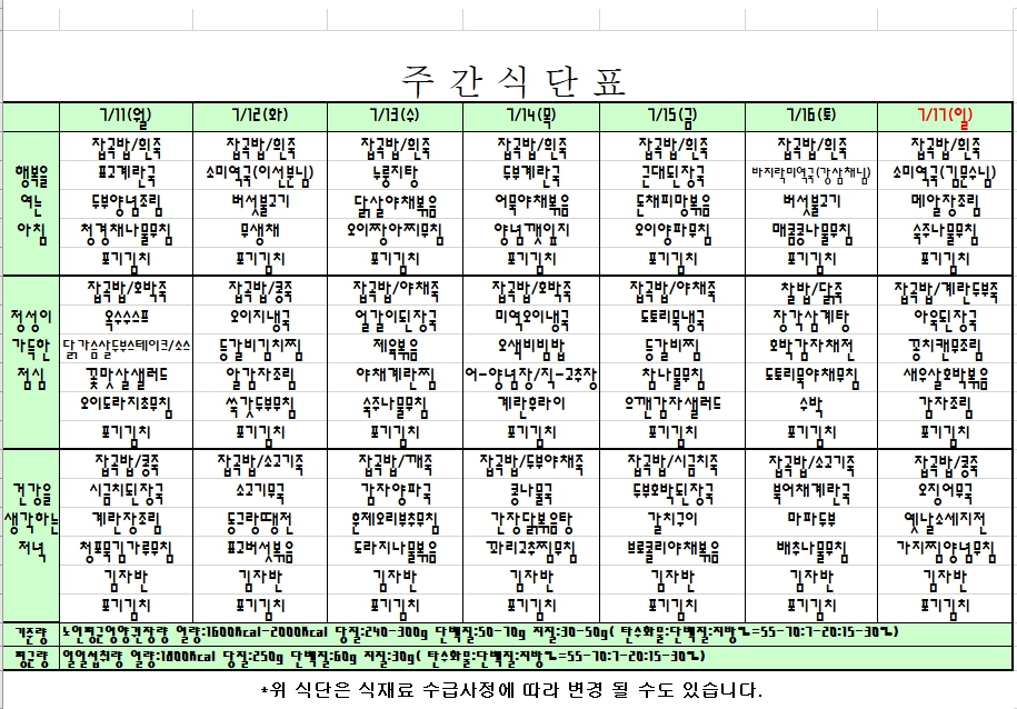 2022. 07. 11 ~ 07. 17  주간식단표 입니다.