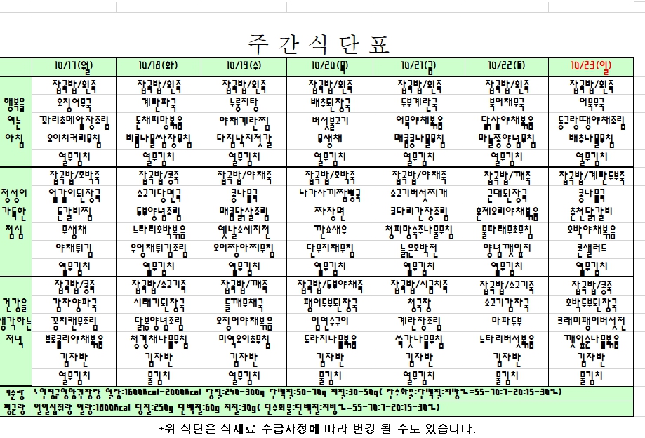 2022. 10. 17 ~ 10. 23  주간식단표 입니다.