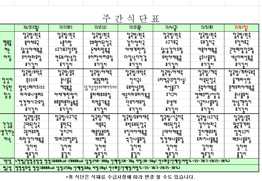 2022. 10. 31 ~ 11. 06 주간식단표