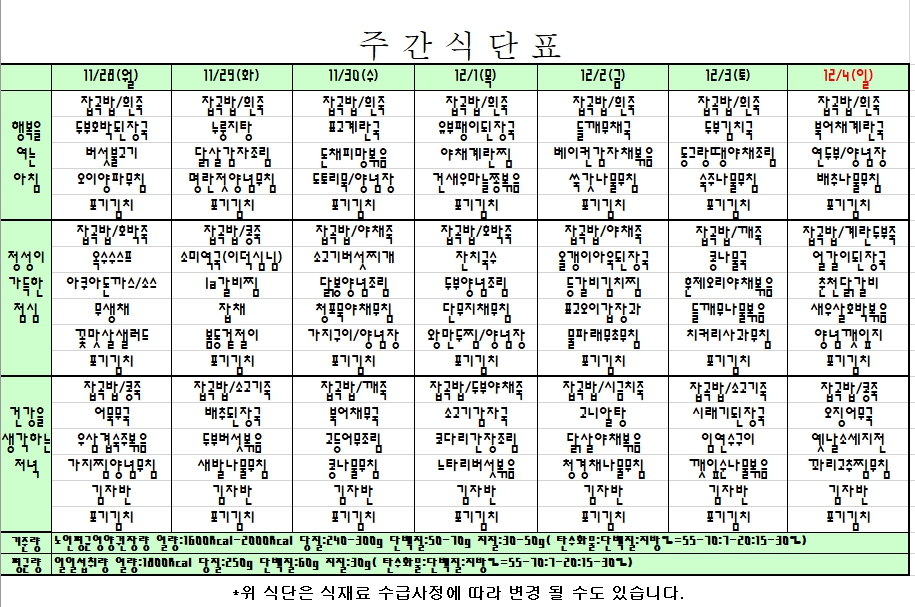 2022. 11. 28 ~ 12. 04 주간식단표 입니다. |
