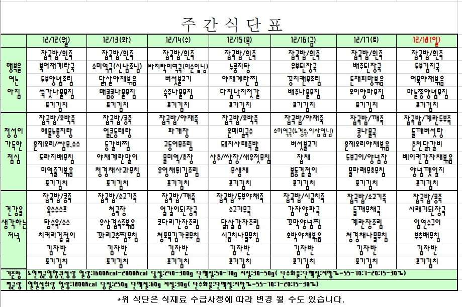 2022. 12. 12 ~ 12. 18 주간식단표 입니다. |