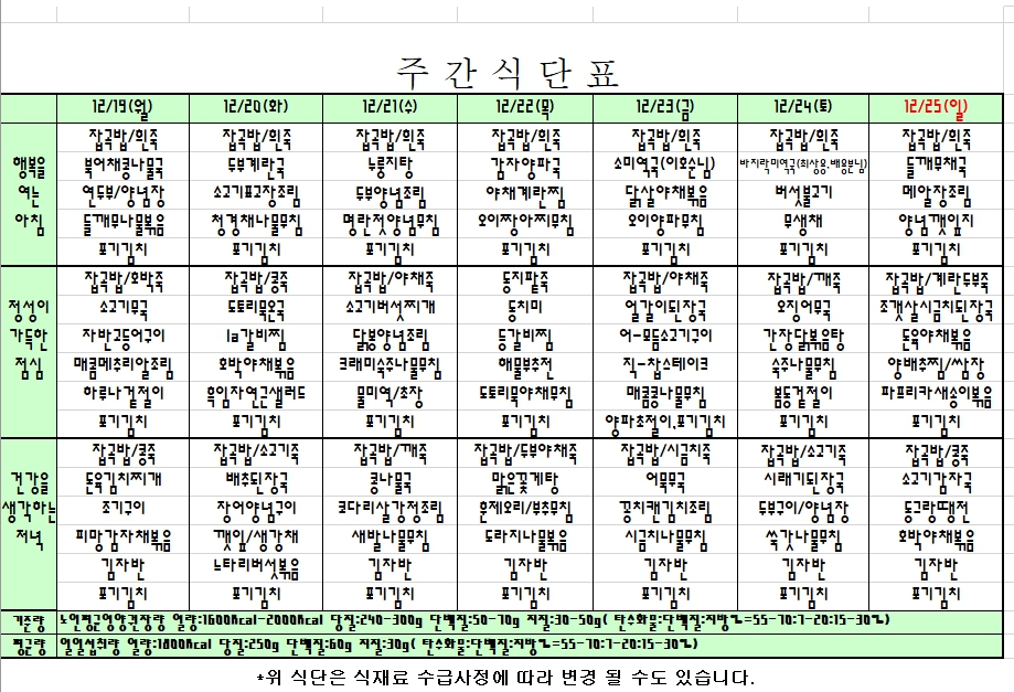 2022. 12. 19 ~ 12. 25 주간식단표 입니다.