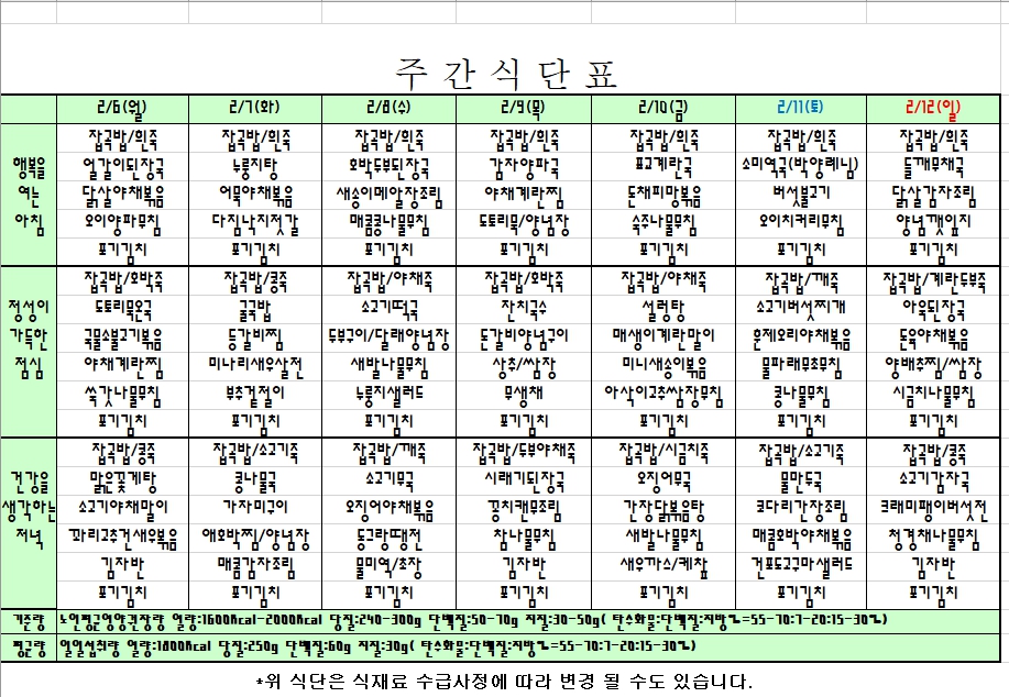 2023. 2. 6 ~ 2. 12 주간식단표 입니다. |