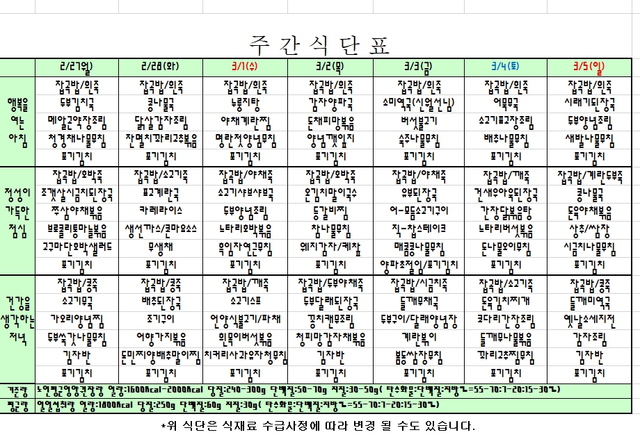 2023. 2. 27 ~ 3. 5 주간식단표 입니다. |