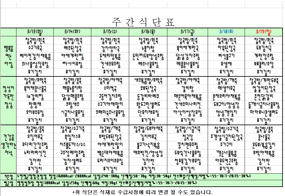2023. 3. 13 ~ 3. 19 주간식단표 입니다. |