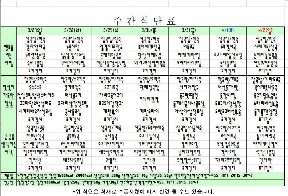 2023. 3. 27 ~ 4. 2 주간식단표 입니다. |