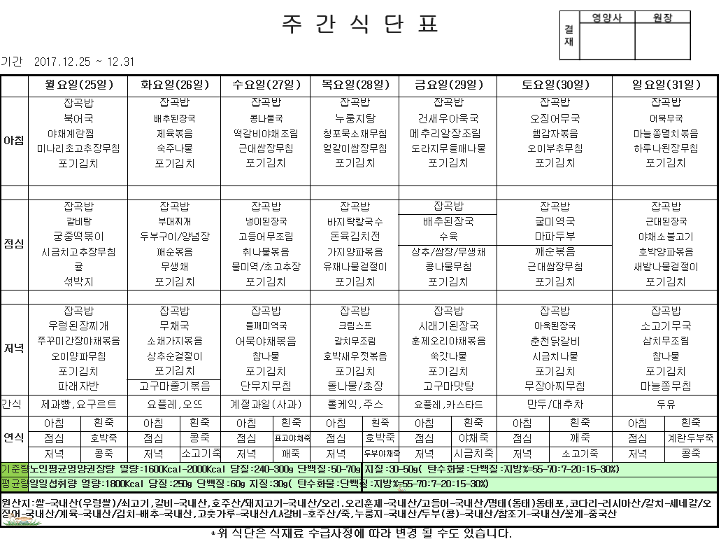 | 2017년 12월 25일 ~ 31일 식단표 관리자2017-12-26조회수 3587 |