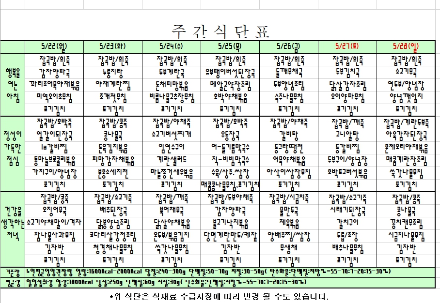 2023. 5. 22 ~ 5. 28 주간식단표 입니다. |