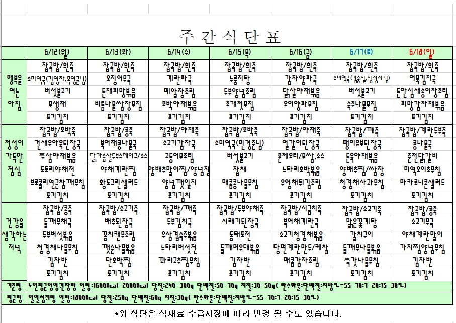 2023. 6. 12 ~ 6. 18 주간식단표 입니다. |