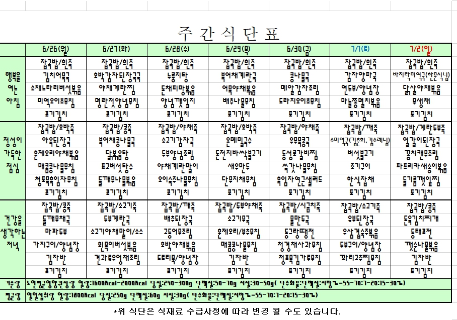 2023. 6. 26 ~ 7. 2주간식단표 입니다. |