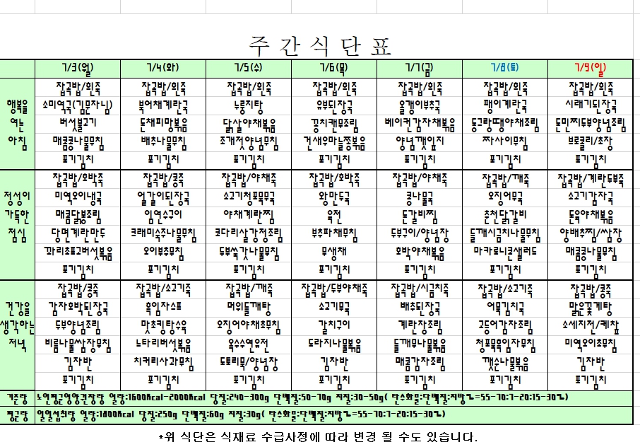 2023. 7. 3 ~ 7. 9 주간식단표 입니다. |