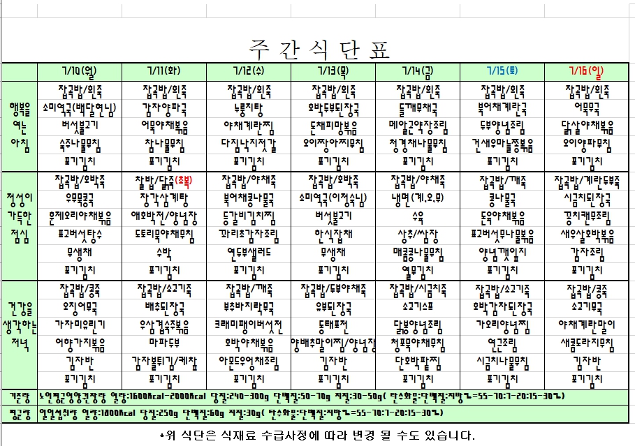 2023. 7. 10 ~ 7. 16 주간식단표 입니다. |