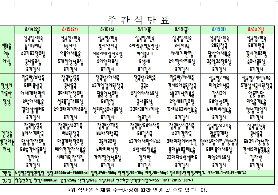 2023. 8. 14 ~ 8. 20 주간식단표 입니다. |