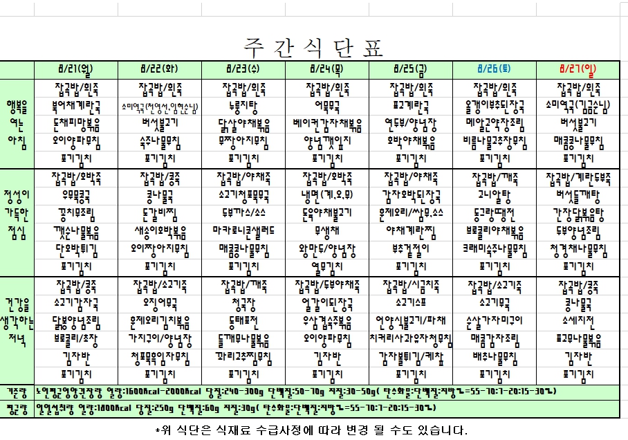 2023. 8. 21 ~ 8. 27 주간식단표 입니다. |