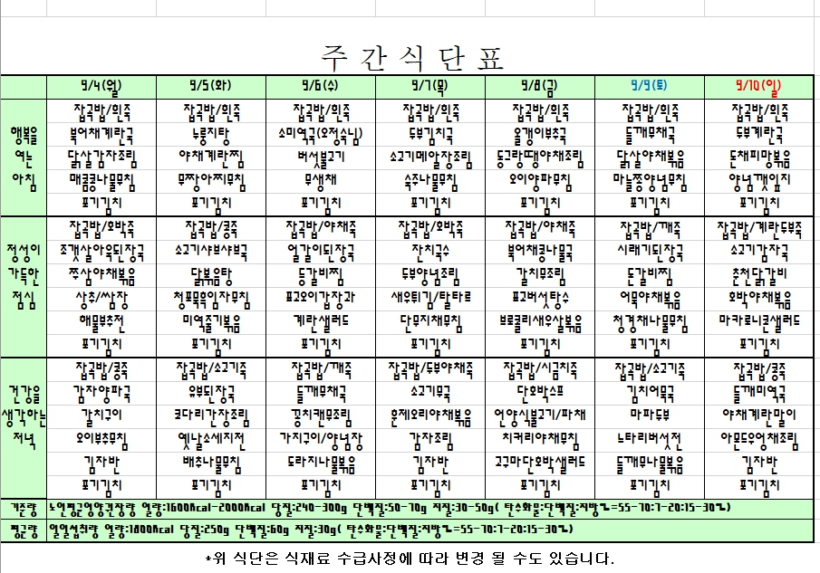 2023. 9. 4 ~ 9. 10 주간식단표 입니다. |
