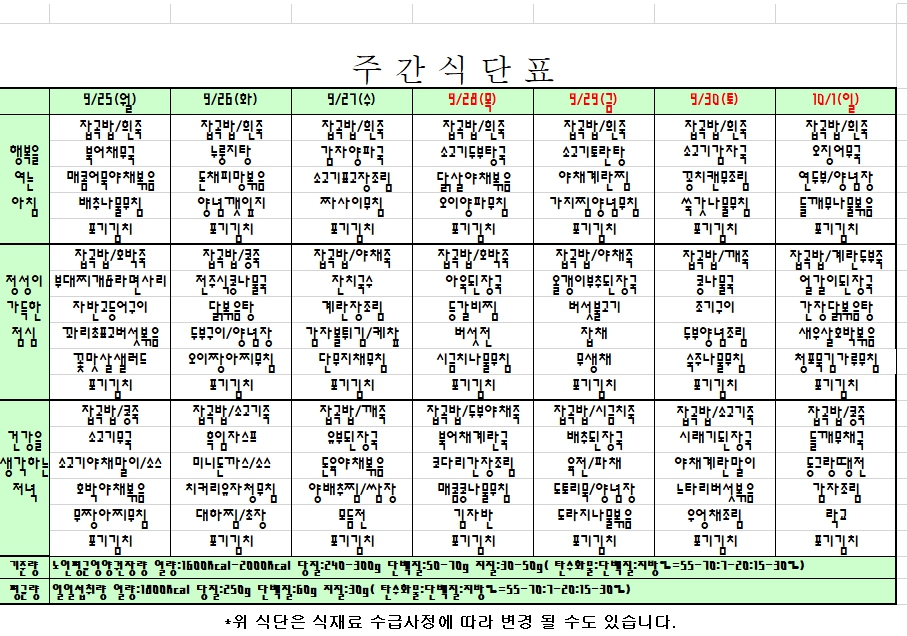 2023. 9. 25 ~ 10. 1 주간식단표 입니다. |