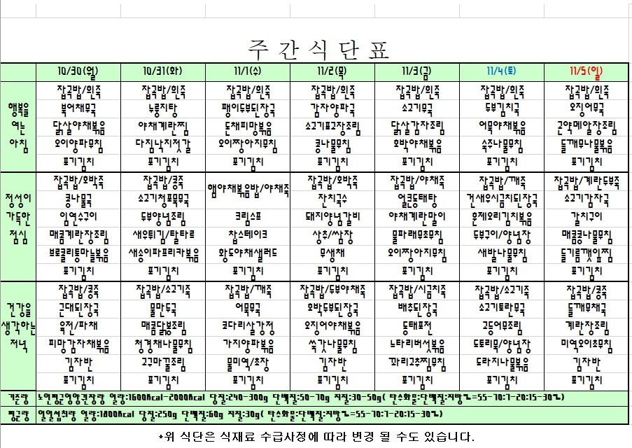 2023. 10. 30 ~ 11. 5 주간식단표 입니다. |