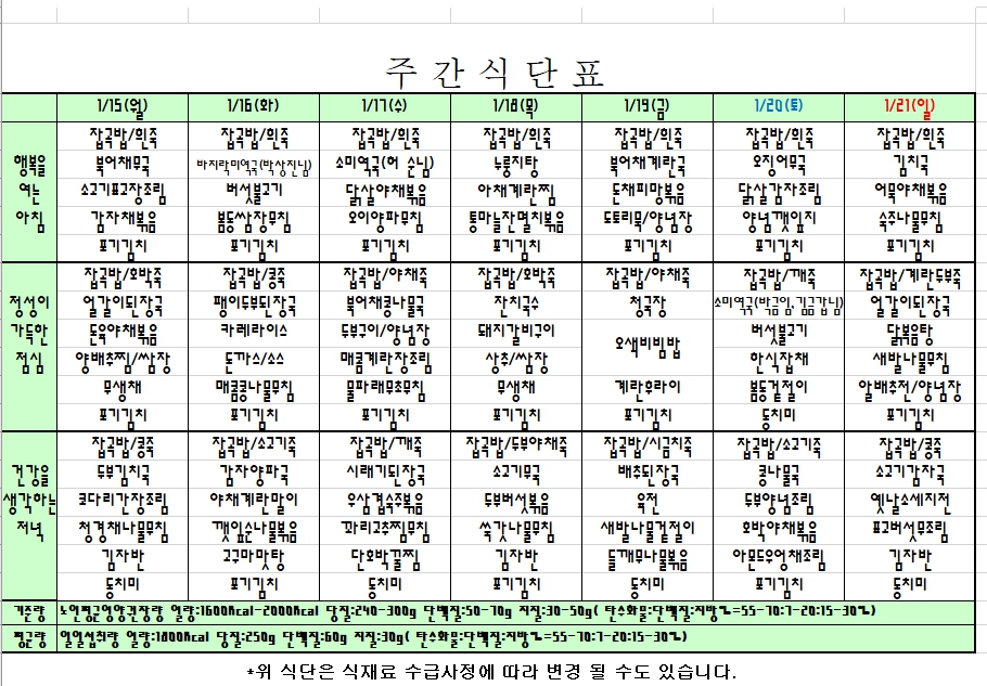 2024. 1. 15 ~ 1. 21 주간식단표 입니다. |