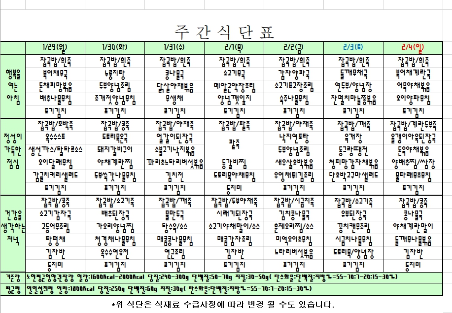 2024. 1. 29 ~ 2. 4 주간식단표 입니다. |