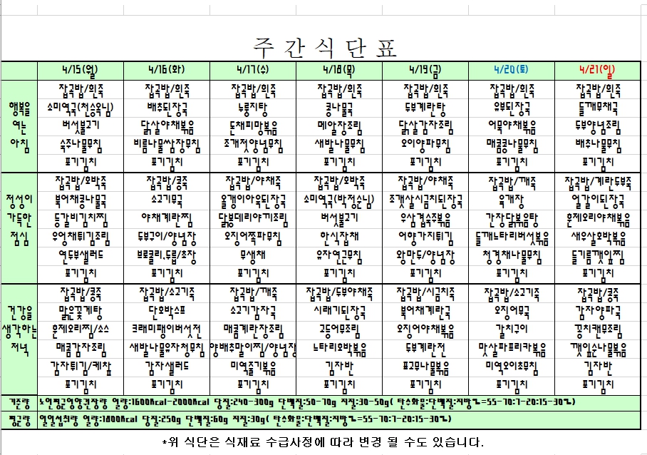 2024. 4. 15 ~ 4. 21 주간식단표 입니다. |