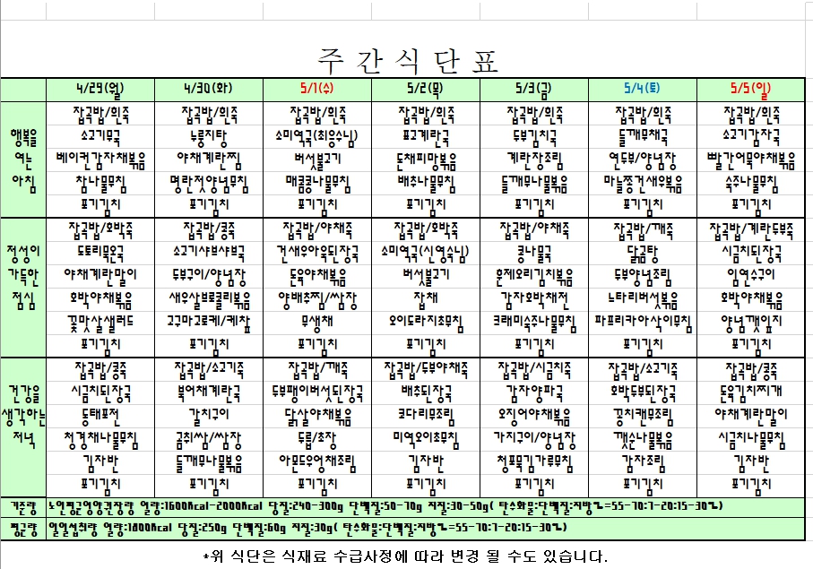 2024. 4. 29 ~ 5. 5 주간식단표 입니다. |