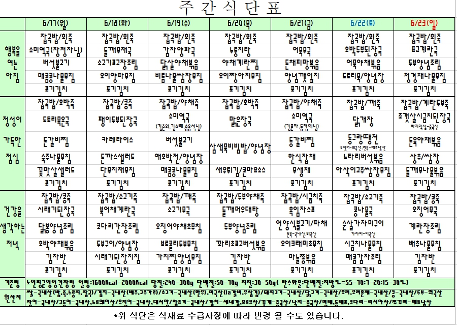 2024. 6. 17 ~ 6. 23 주간식단표 입니다. |