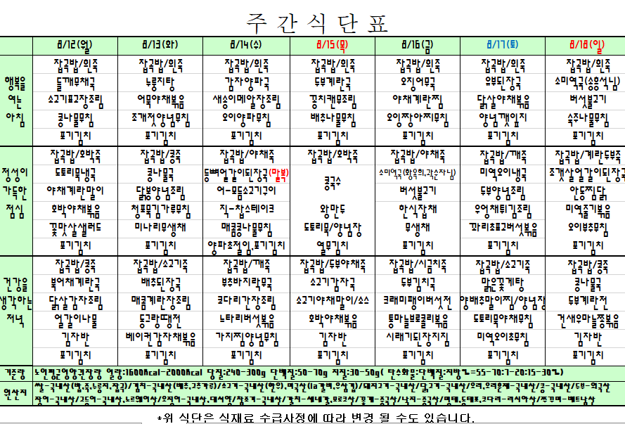 2024. 8. 12 ~ 8. 18 주간식단표 입니다. |