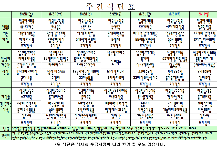 2024. 8. 26 ~ 9. 1 주간식단표 입니다. |