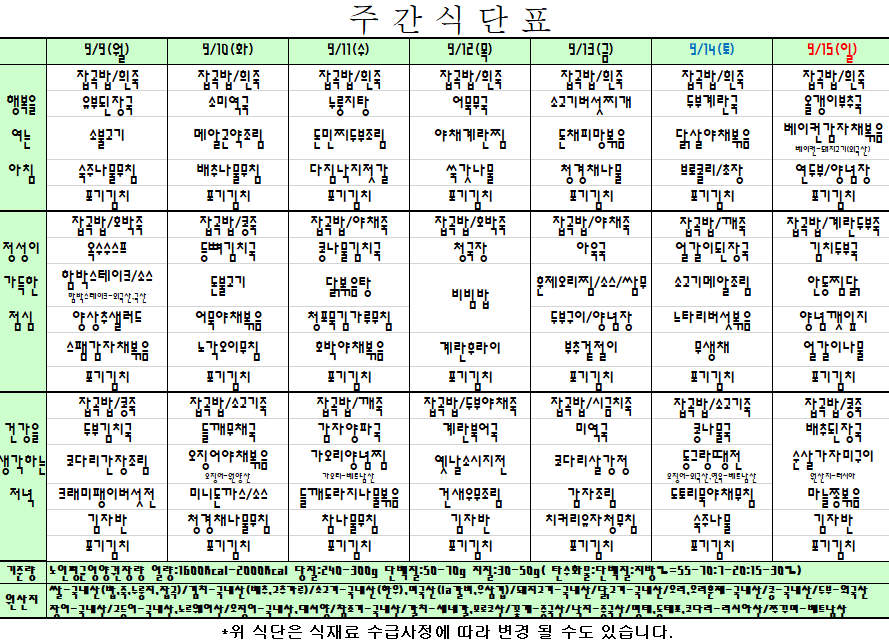 2024. 9. 9 ~ 9. 15 주간식단표입니다. |