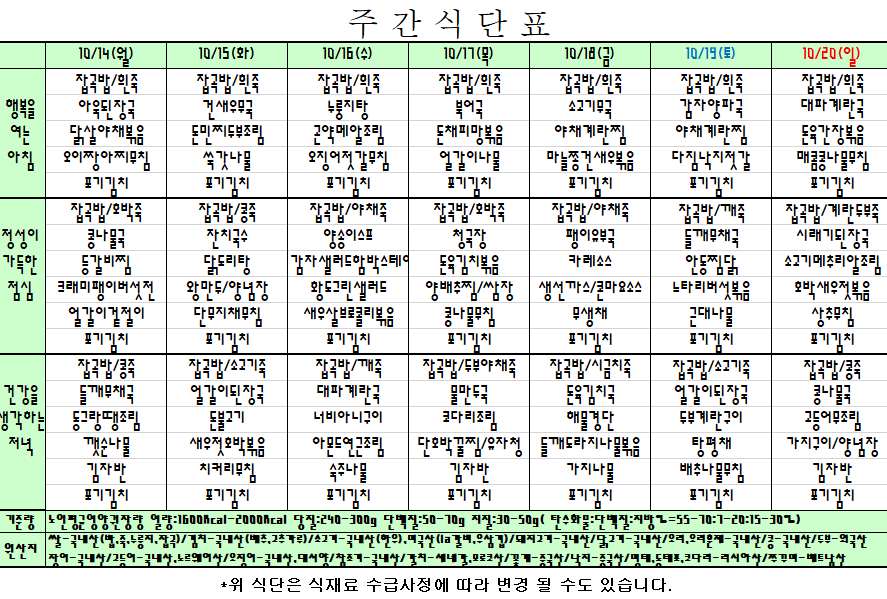 2024. 10. 14 ~ 10. 20 주간식단표입니다. |