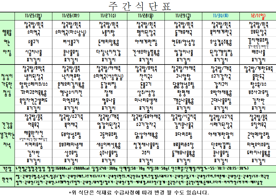 2024. 11. 25 ~ 12. 01 주간식단표입니다. |