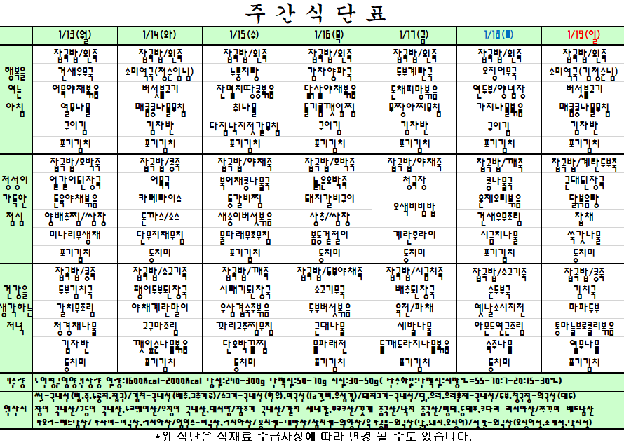2025. 01. 13~ 2025. 01. 19 주간식단표