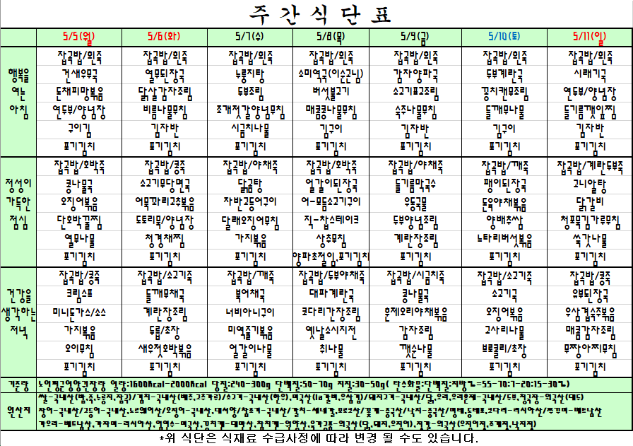 2025. 05. 05~ 2025. 05. 11 주간식단표