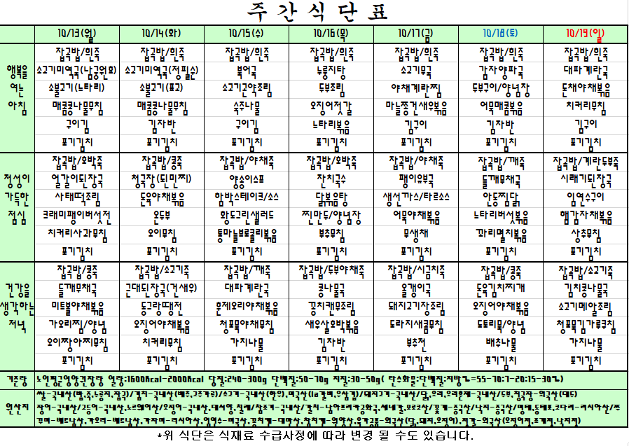 | 주간식단표 25.10.13~25.10.19 관리자2025-10-02조회수 527 |