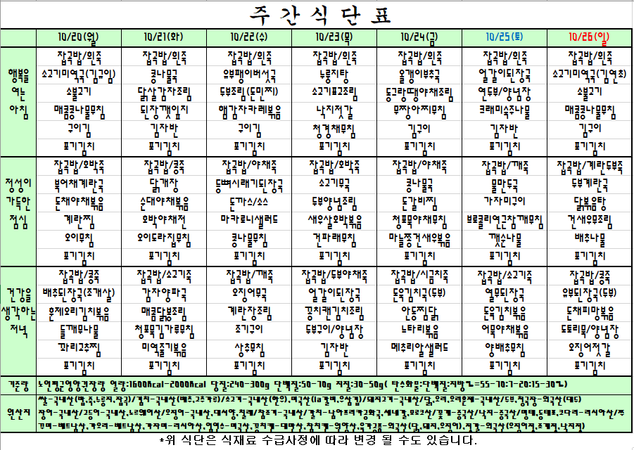 | 25.10.20~25.10.26 주간식단표 관리자2025-10-15조회수 522 |