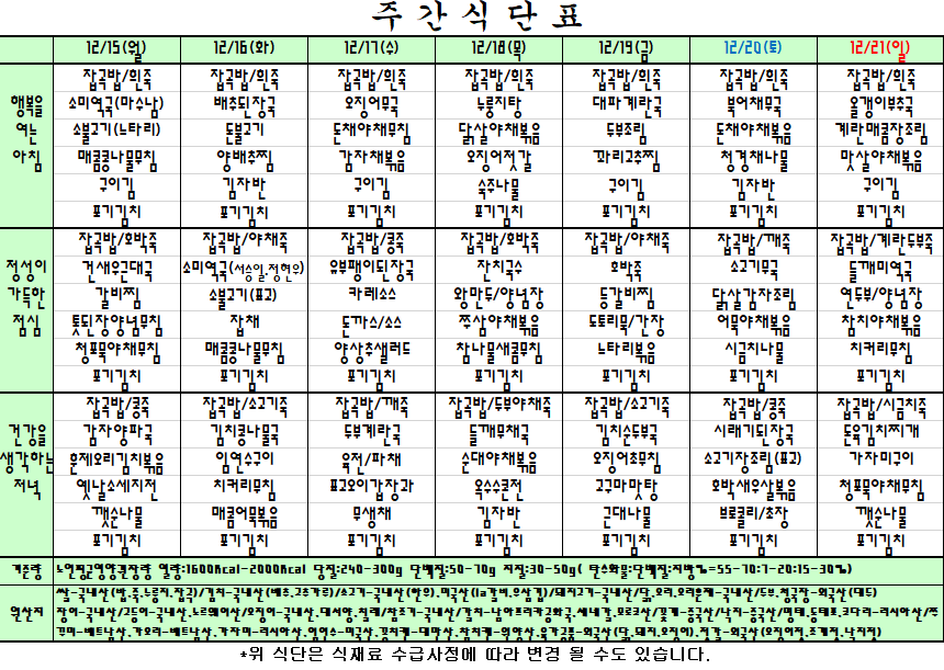 | 25.12.15~25.12.21주간식단표 관리자2025-12-10조회수 354 |
