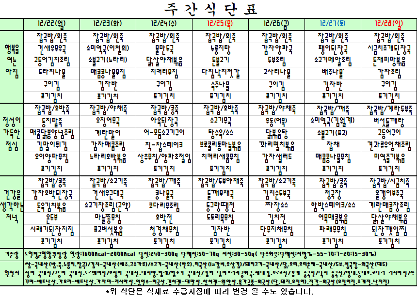 | 25.12.22~25.12.28 주간식단표 관리자2025-12-17조회수 344 |
