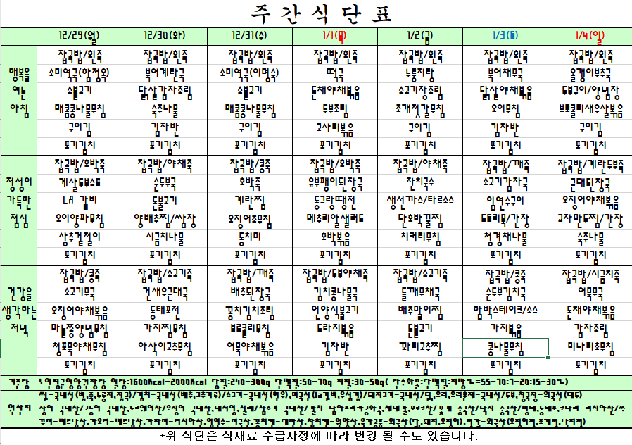 | 이전글 | 26.1.5~26.1.11주간식단표 |