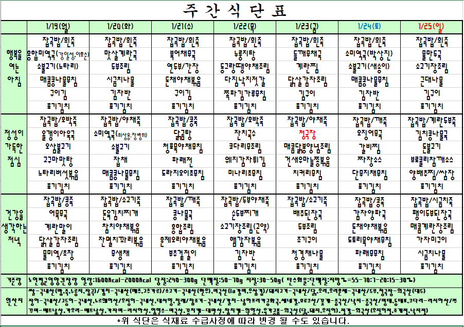 | 26.1.19~26.1.25주간식단표 관리자2026-01-14조회수 286 |