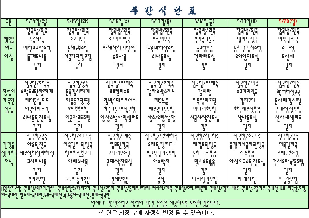 | 2018.05.14.~05.20. 식단표 관리자2018-05-14조회수 3676 |