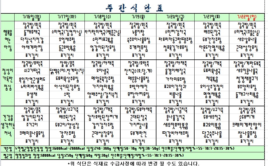 2018.07.16.~07.22. 식단표입니다. ^^ |