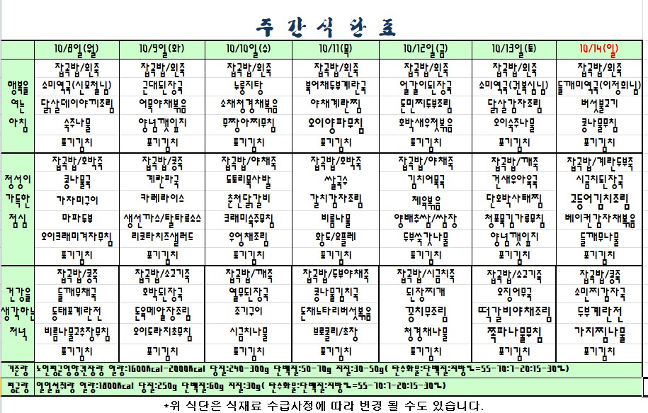 2018.10.08.~10.14. 식단표 |