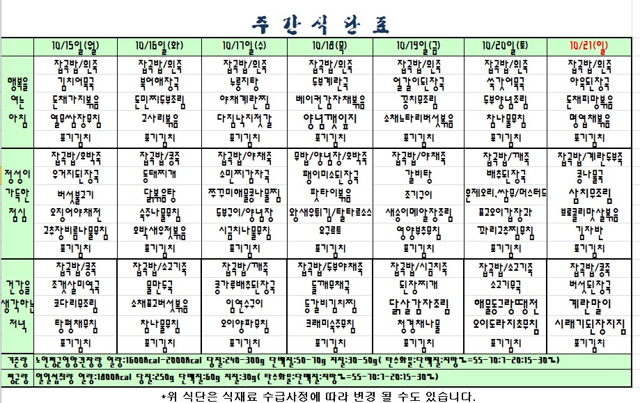 2018.10.15.~10.21. 식단표 |