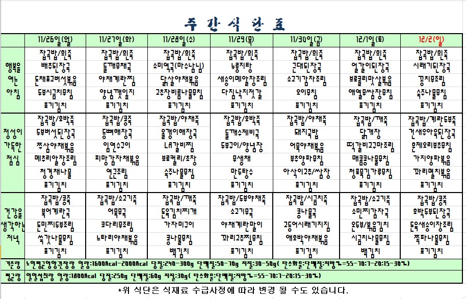 2018.11.26.~12.02. 식단표 |