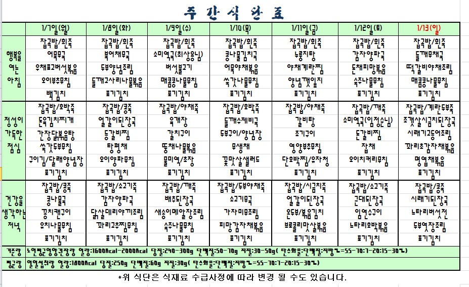 2019.1.7.~1.13. 식단표 |