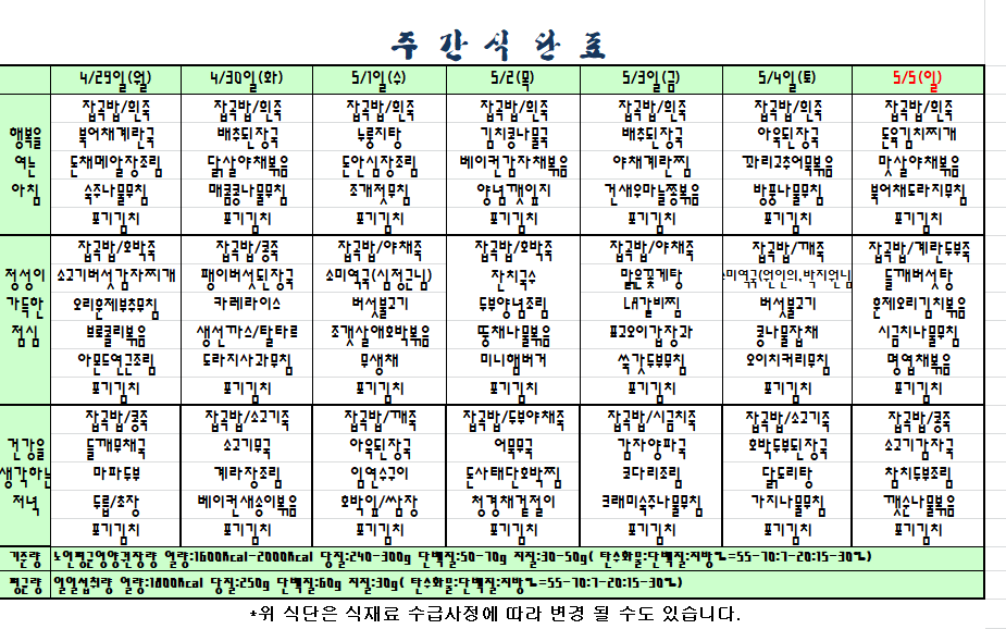2019.04.29~05.05 주간식단표